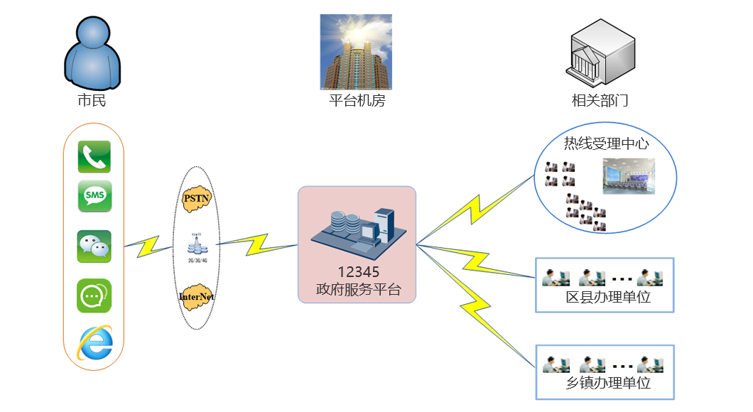 如此,在實現對市民意見、問題求助、建議、投訴、表揚等各類民生信息進行廣泛收集、高效分析、及時處理、及時回復的同時,通過現代科技手段和信息技術提高政府服務熱線對市民的服務的能力。系統組網示意圖