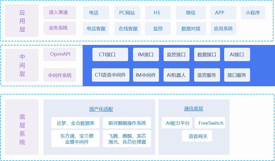 采用中間層方式將應用與底層進行分隔,屏蔽復雜的語音通信技術及AI人工智能技術,集成商負責應用層開發,調用簡單接口即可完成集成工作。