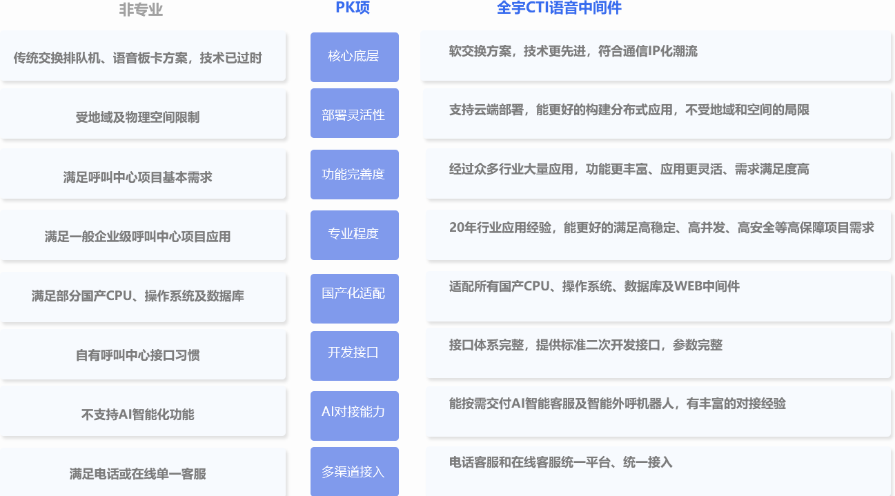 全宇CTI語音中間件支持SIP軟電話、WEBRTC網頁電話、AI機器人對接、與IM集成為客服統一平臺等等。
